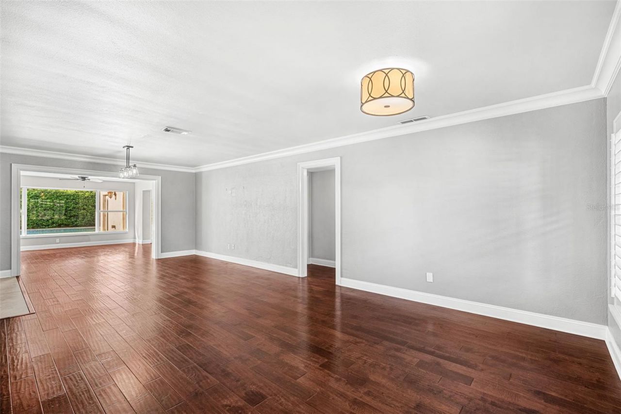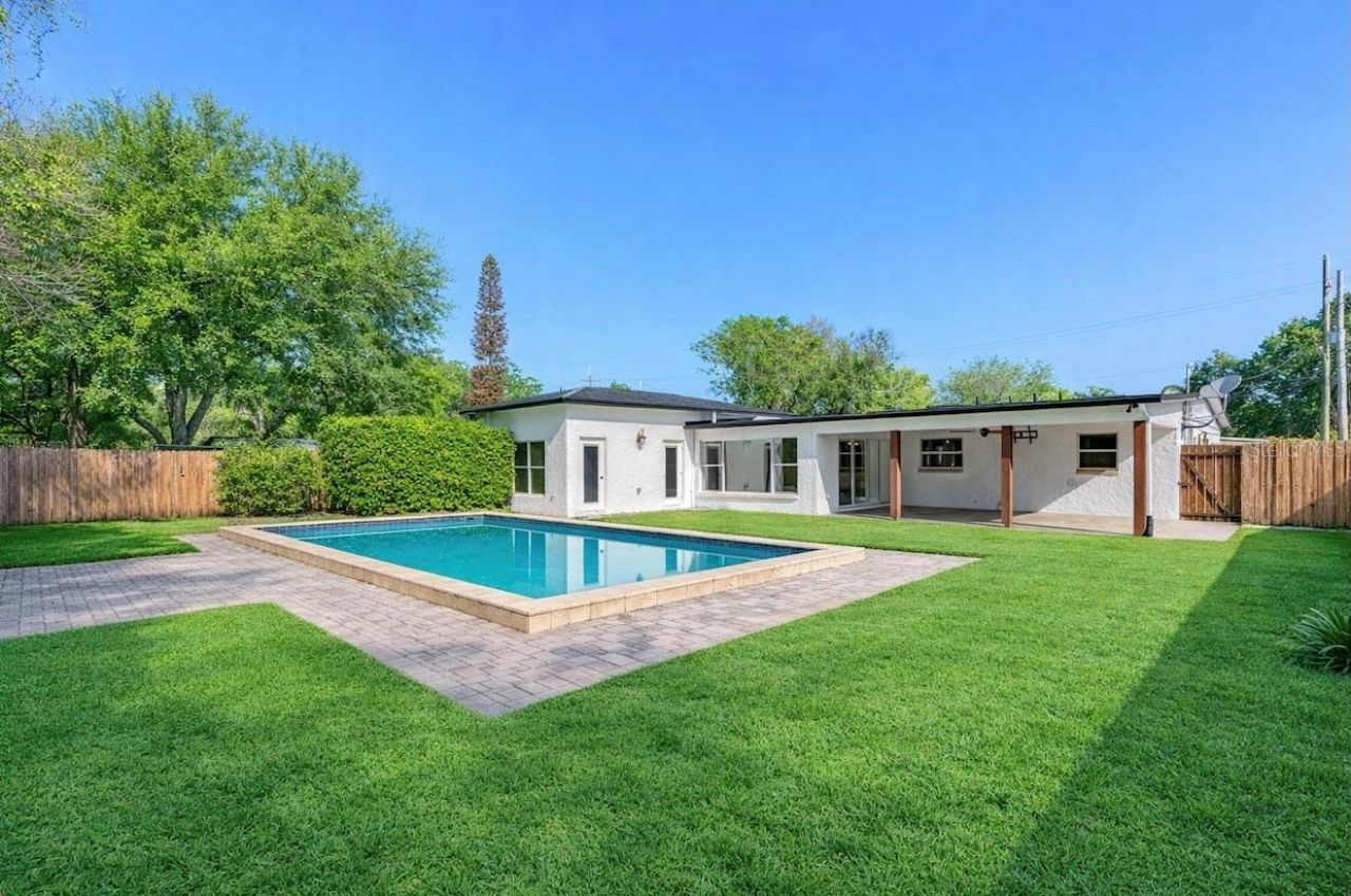Welcome to an expansive modern ranch with elegant interior finishes and remodeled living spaces thoughtfully designed to accommodate households of all types. Set in the heart of College Park, this home sits within walking distance of AdventHealth's Rollins Campus, the Princeton SunRail Station, the College Park Pool and Community Center, the Edgewater Drive shopping and dining district, and the historic Dubsdread Golf Course and TapRoom. As you approach, you are greeted by manicured landscaping, a fully pavered driveway and porch, and an upgraded decorative garage door with coach lights. Upon entering, you step into an impressive open living area with direct views of the private backyard and pool framed by three wide format windows. The light and bright front living room features plantation shutters, designer lighting, crown molding, and tasteful hand scraped hardwood floors that continue throughout the main living areas, creating a warm and welcoming first impression. The dining area occupies the center of this expansive flex space with pendant lighting, room for large gatherings, and seamless flow into the modern kitchen with a breakfast bar. Chefs and food lovers will appreciate the abundant counter and prep space, stylish backsplash, recessed lighting, generous cabinet storage, and a pantry with extra deep pull-out shelving for easy access to ingredients and appliances. Beyond the kitchen, an inviting family room provides a comfortable place to relax with morning coffee, enjoy wine with friends after dinner, or celebrate holidays and special occasions with wide open access to the spacious covered lanai and expansive private backyard. The completely remodeled primary suite adds a level of refinement rarely found in Orlando's most established neighborhoods. A private entry hall opens to a room with a soaring tray ceiling, added windows, and smooth access to the backyard patio. This owner's retreat has ample space for a king furniture suite, along with a large walk-in closet and linen closet. The ensuite spa-style bath features a generous walk-in shower with dual rain shower heads, floor to ceiling tile, a frameless glass entry, and a spacious dual glass top vanity with under-sink storage and upgraded lighting. Across the home, a second spacious bedroom with its own ensuite bath creates an ideal setup for guests who appreciate comfort and privacy. Two additional generously sized bedrooms share a third full bath with a tub shower combination and complete the interior living space of this exceptional College Park residence. The laundry and utility room sit just off the garage with interior access and an upgraded water heater. Whether you prefer staying close to home for neighborhood events like Jazz Fest or Holiday on the Drive, or taking the train to Winter Park for dinner on world-renowned Park Avenue, this location offers incredible convenience along with a peaceful retreat at the end of a short walk, bike ride, or drive home.